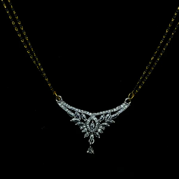 •Elegant double-string mangalsutra featuring a diamond-style winged motif with a central drop pendant