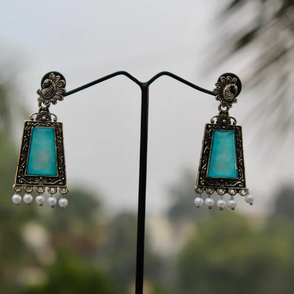 Elevate your ethnic style with the timeless charm of Neel Trapeze Drops. Crafted in an antique oxidized finish, these earrings feature a striking turquoise-blue trapeze stone framed with intricate detailing and finished with delicate pearl drops. The elegant silhouette adds a refined statement while remaining lightweight and comfortable for all-day wear.
