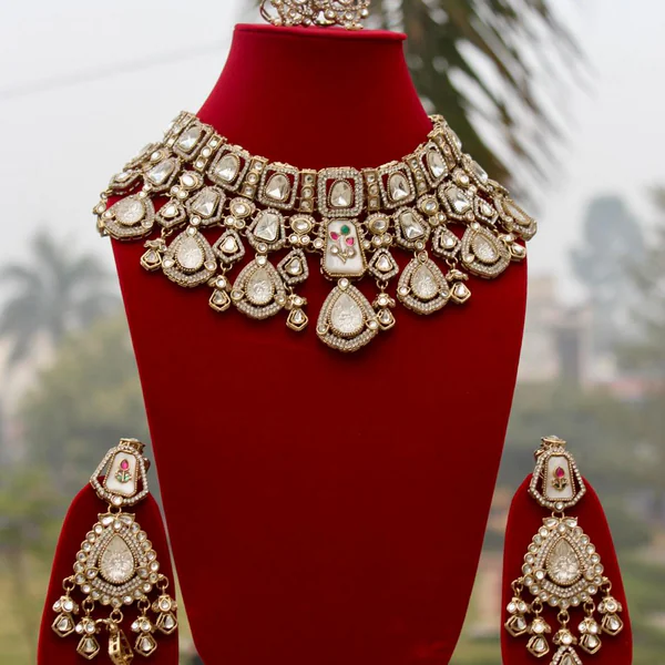 A luxurious bridal kundan set featuring a richly detailed necklace with layered teardrop stones and matching statement earrings. Designed for brides seeking a regal, timeless wedding look.