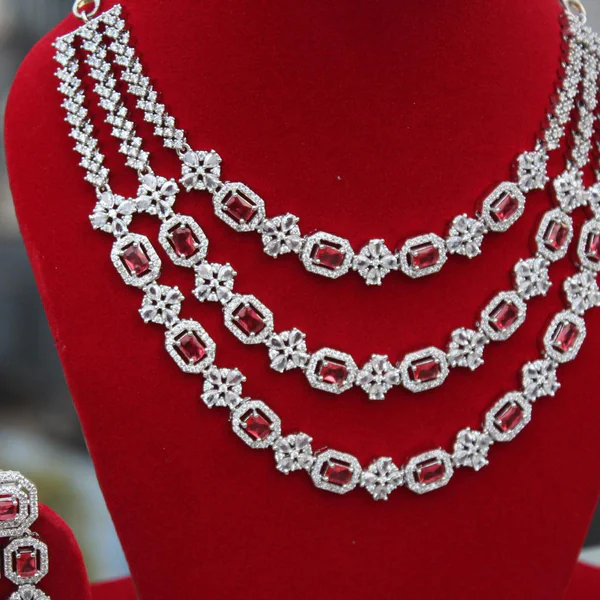 A luxurious layered jewellery set featuring diamond-cut detailing with rose-toned stone accents, paired with matching statement earrings. Elegant, refined, and designed to stand out at special celebrations.