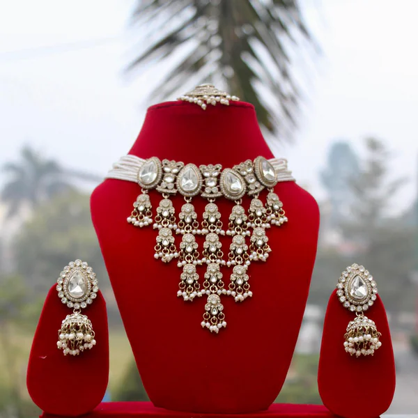 A classic bridal jewellery set crafted with kundan-style stones, layered pearl detailing, and cascading drop work, paired with matching jhumka earrings. Rich, traditional, and perfect for a royal wedding look.